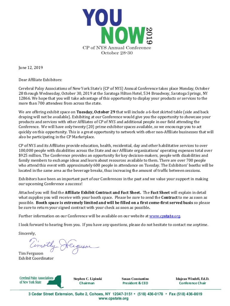 June 12, 2019, Dear Affiliate Exhibitors: Cerebral Palsy Associations of New York States (CP of NYS) Annual Conference takes place Monday, October 28 through Wednesday, October 30, 2019, at the Saratoga