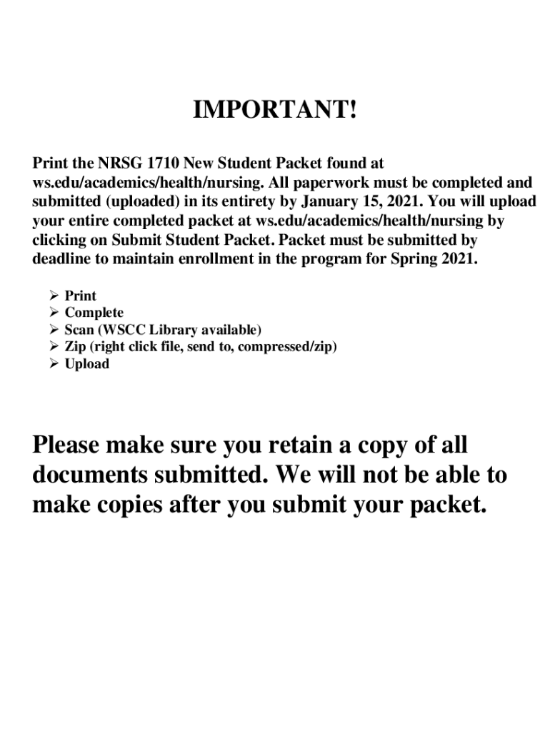 IMPORTANT! Print the NRG 1710 New Student Packet found at ws.edu/academics/health/nursing. All paperwork must be completed and submitted (uploaded) in its entirety by January 15, 2021. You will upload