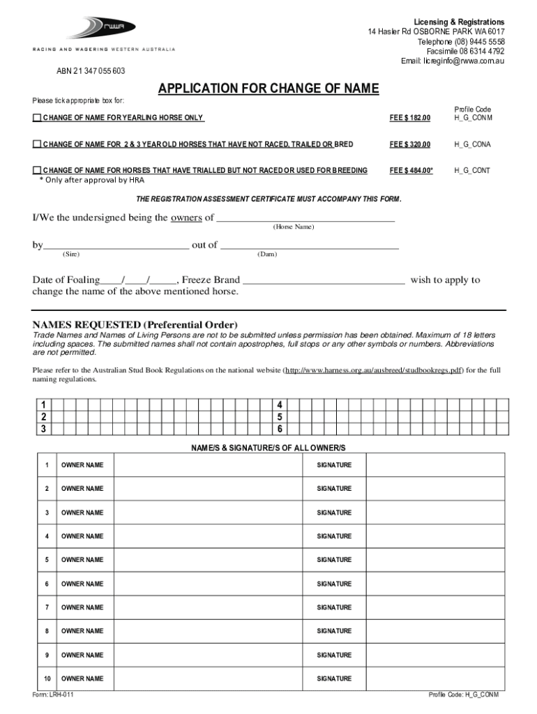 Licensing & Registrations 14 Hauler Rd OSBORNE PARK WA 6017 Telephone (08) 9445 5558 Facsimile 08 6314 4792 Email: licreginfo×rwwa.com.AU ABN 21 347 055 603APPLICATION FOR CHANGE OF NAME Please tick