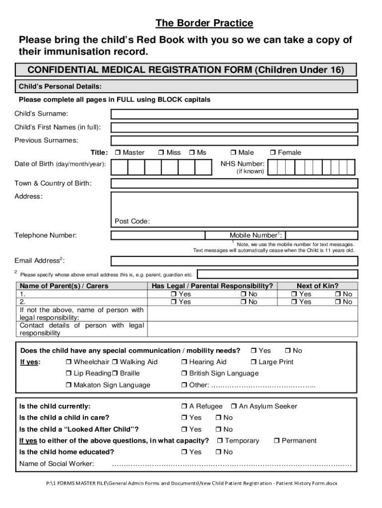 The Border Practice Please bring the children Red Book with you, so we can take a copy of their immunization record. CONFIDENTIAL MEDICAL REGISTRATION FORM (Children Under 16) Child's Personal Details: