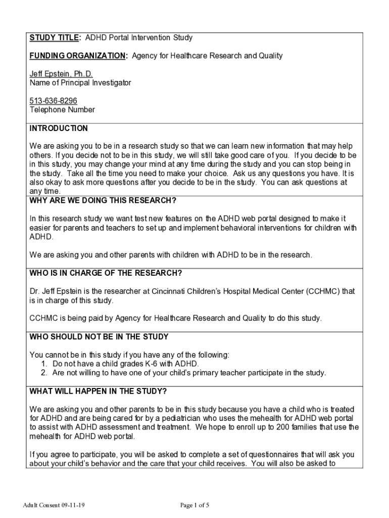 STUDY TITLE: ADHD Portal Intervention Study FUNDING ORGANIZATION: Agency for Healthcare Research and Quality Jeff Epstein, Ph.D. Name of Principal Investigator 5136368296 Telephone Number INTRODUCTION