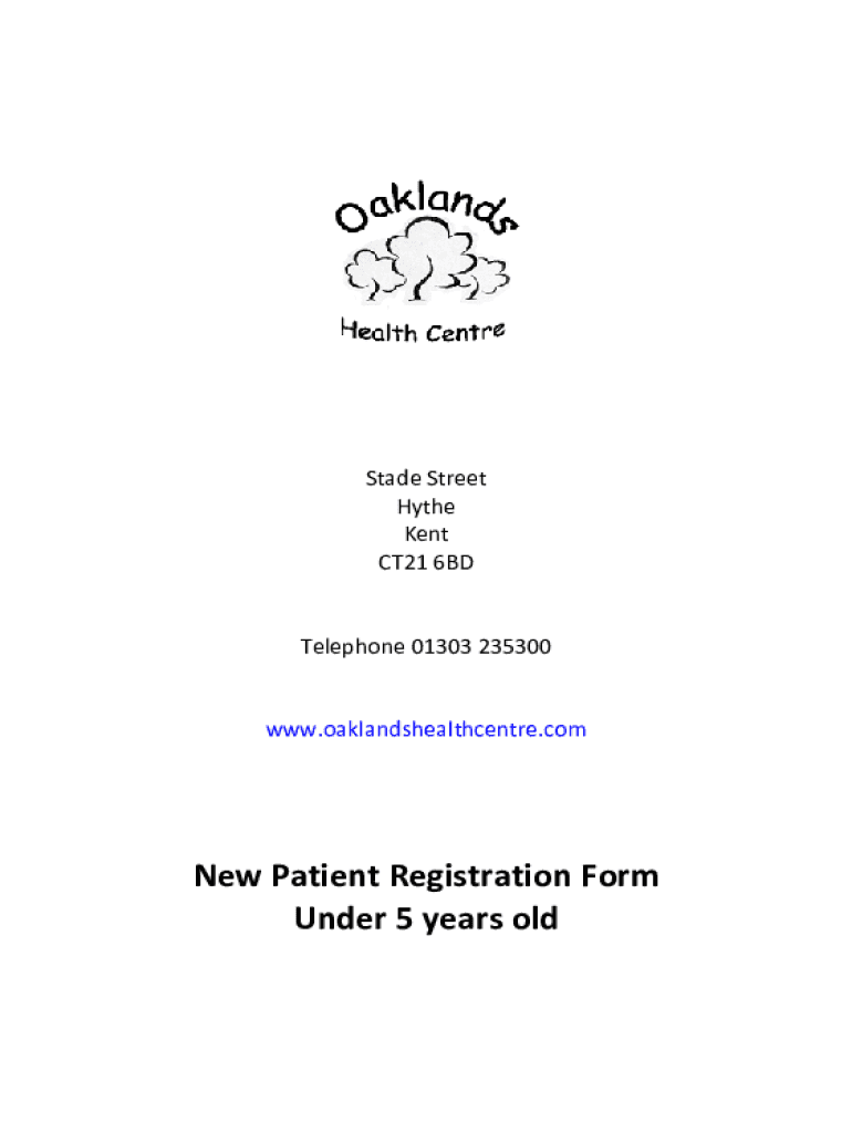 State Street The Kent CT21 6BDTelephone 01303 235300www.oaklandshealthcentre.come Patient Registration Form Under 5 years welcome to the Oakland's Health Center We aim to help you stay healthy and
