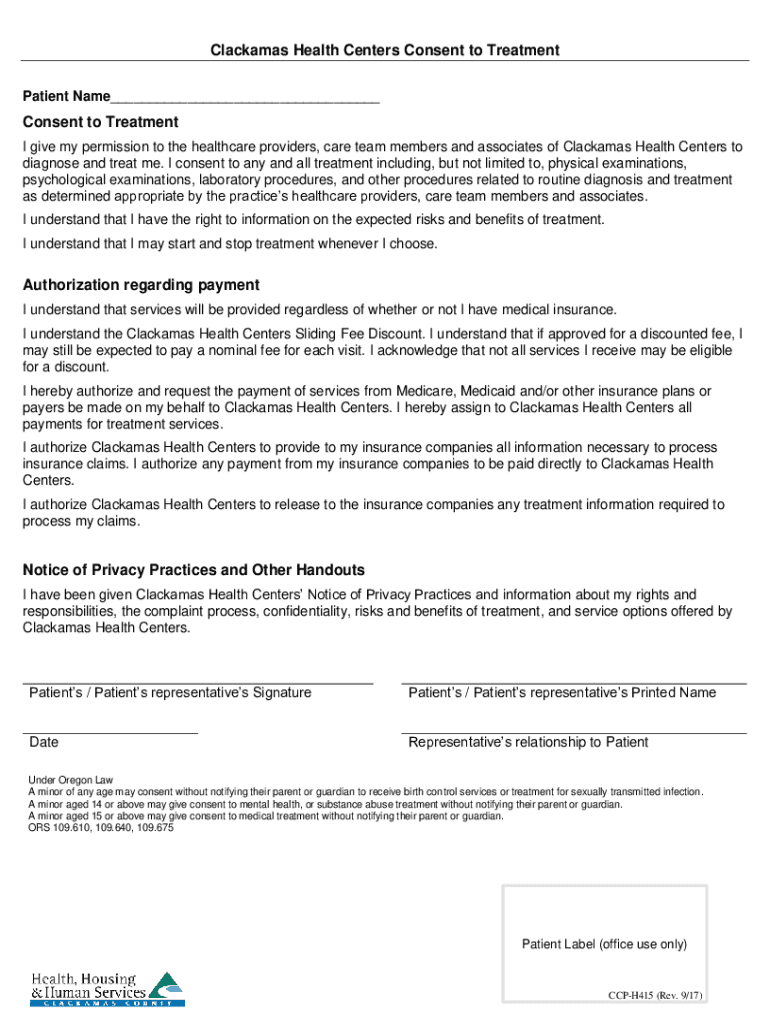 Clacks Health Centers Consent to Treatment Patient Name___Consent to Treatment I give my permission to the healthcare providers, care team members and associates of Clacks Health Centers to diagnose