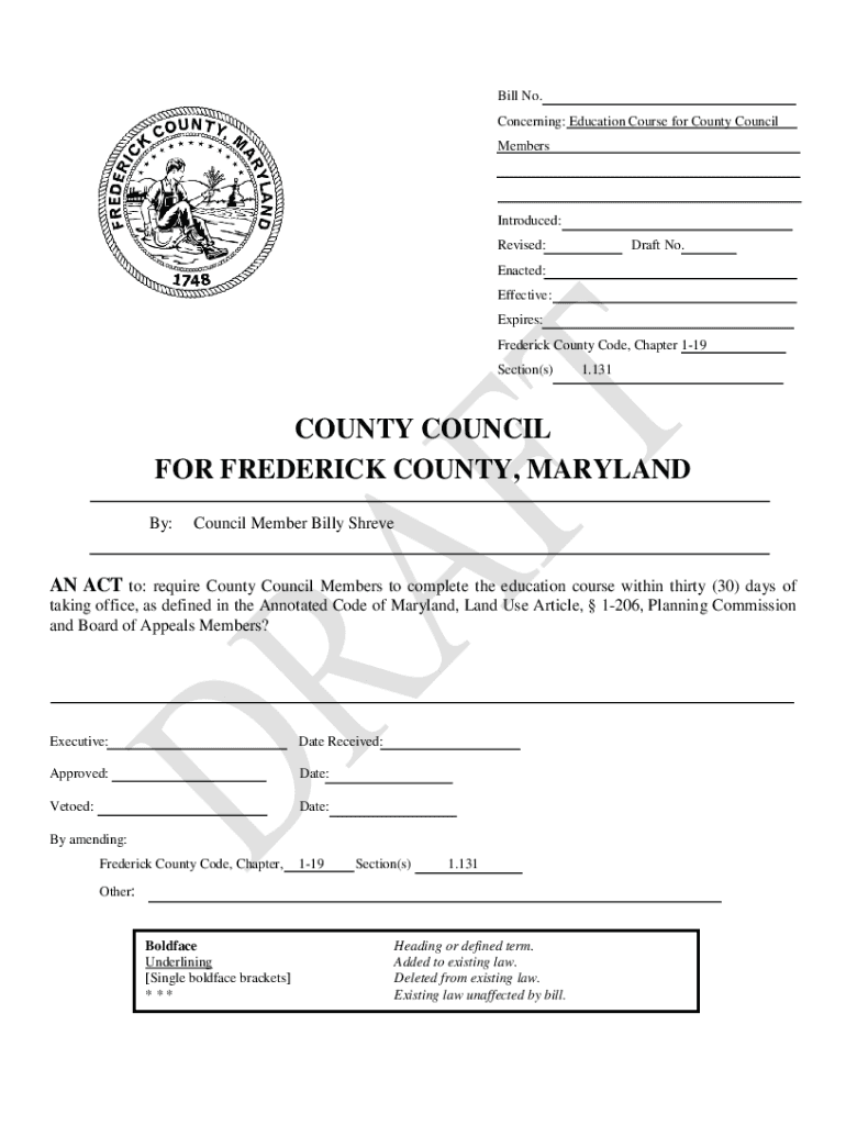Bill No. Concerning: Education Course for County Council MembersIntroduced: Revised:Draft No. Enacted: Effective: Expires: Frederick County Code, Chapter 119 Section(s)1.131COUNTY COUNCIL FOR FREDERICK