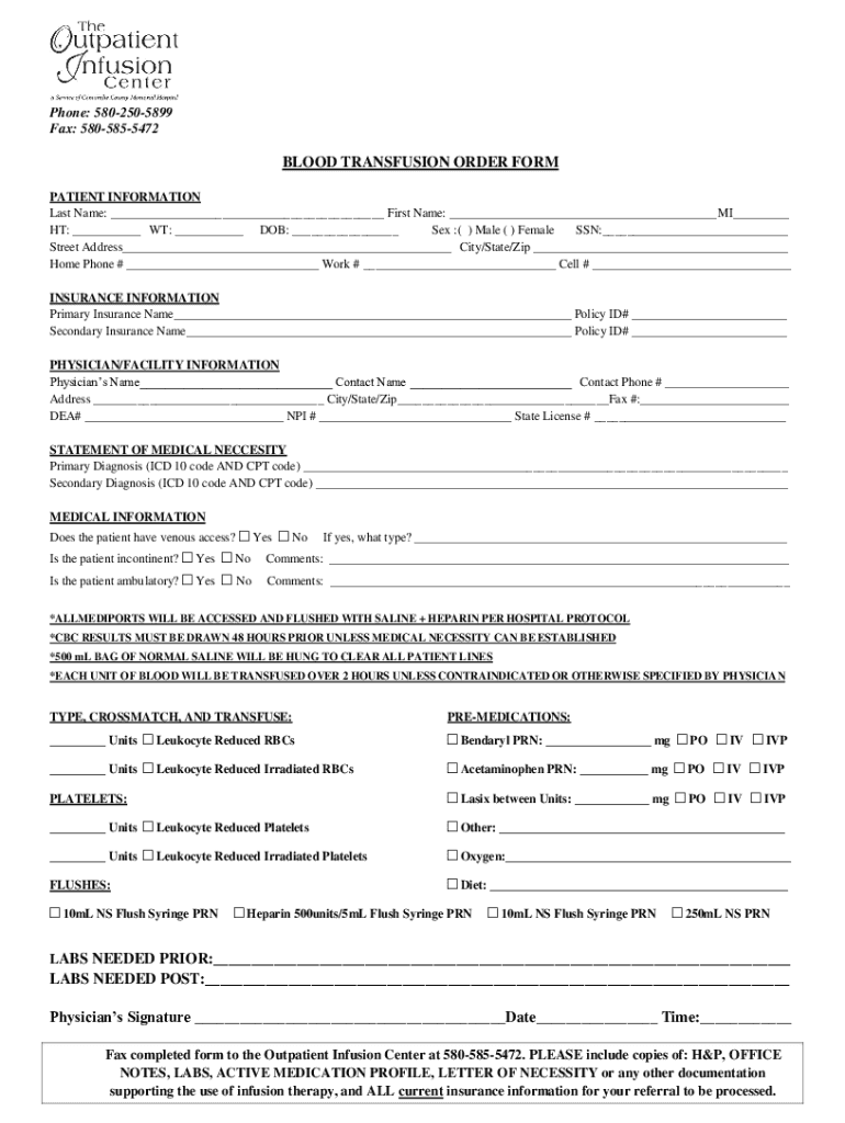 Phone: 5802505899 Fax: 5805855472BLOOD TRANSFUSION ORDER FORM PATIENT INFORMATION Last Name: ___ First Name: ___ MI___ HT: ___ WT: ___ DOB: ___ Sex :() Male () Female SSN:___ Street Address___ City/State/Zip