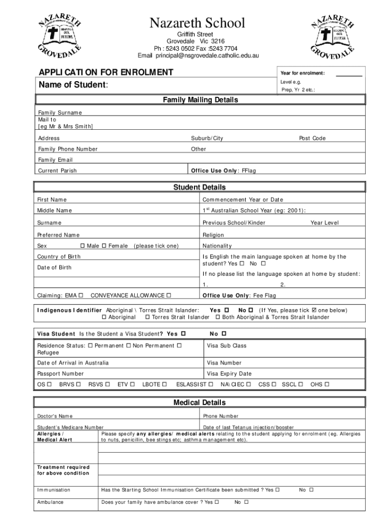 Nazareth School Griffith Street Grove dale Vic 3216 pH : 5243 0502 Fax :5243 7704 Email principal×nsgrovedale.catholic.edu.application FOR Enrollment Name of Student:Year for enrollment: Level e.g.