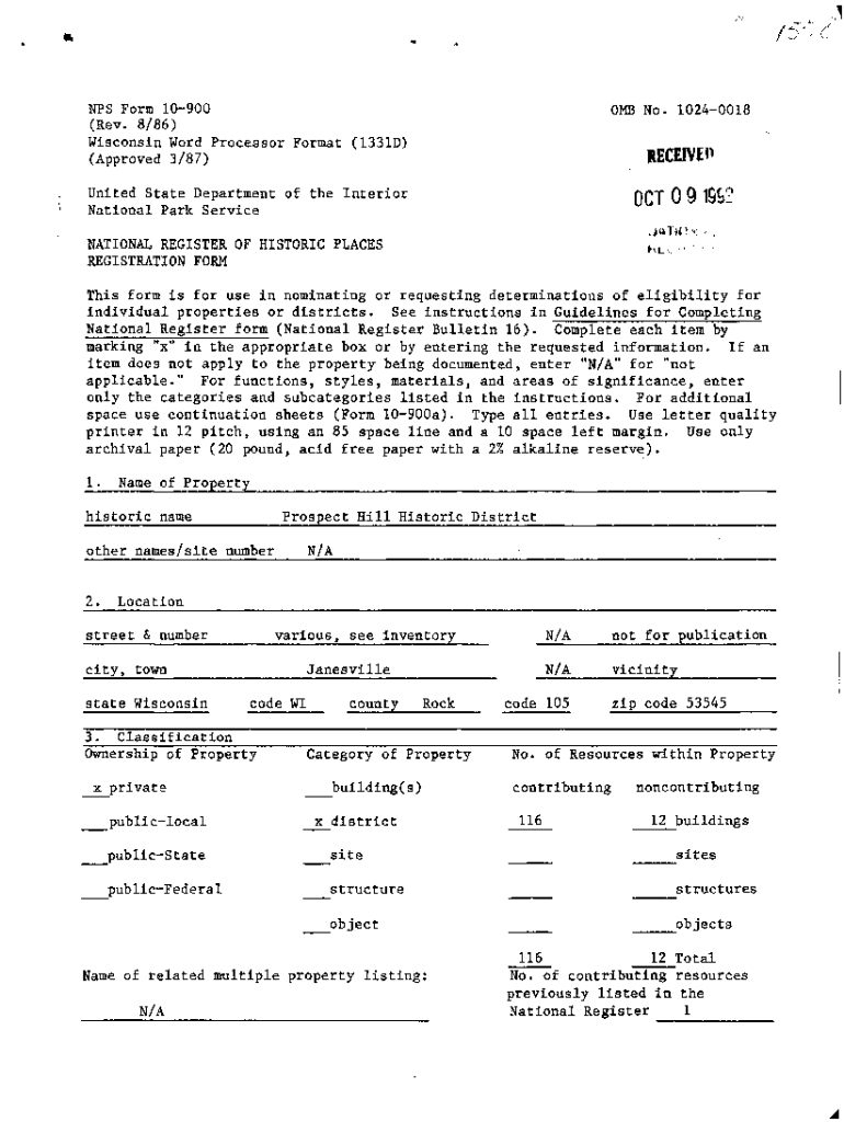 NPS Form 10900 (Rev. 8/86) Wisconsin Word Processor Format (1331D) (Approved 3/87)0 MB No. 10240018United State Department of the Interior National Park Service 0 9 1992RECEIVE×NATIONAL REGISTER