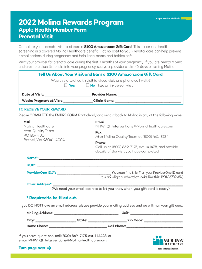 2022 Molina Rewards Program Apple Health Medicaid Apple Health Member Form Prenatal VisitComplete your prenatal visit and earn a ×100 Amazon.com Gift Card! This important health screening is a covered
