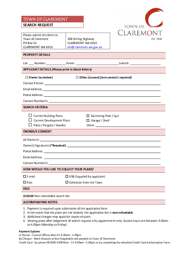 TOWNOFCLAREMONT SEARCHREQUEST 308StirlingHighway CLAREMONTWA6010 TOC×Claremont.Wei.gov.auPleasesubmitthisformto: TownofClaremont POBox54 CLAREMONTWA6910 PROPERTYDETAILS Lot:Number:Street:Suburb:APPLICANTDETAILS(Pleaseprintinblockletters)