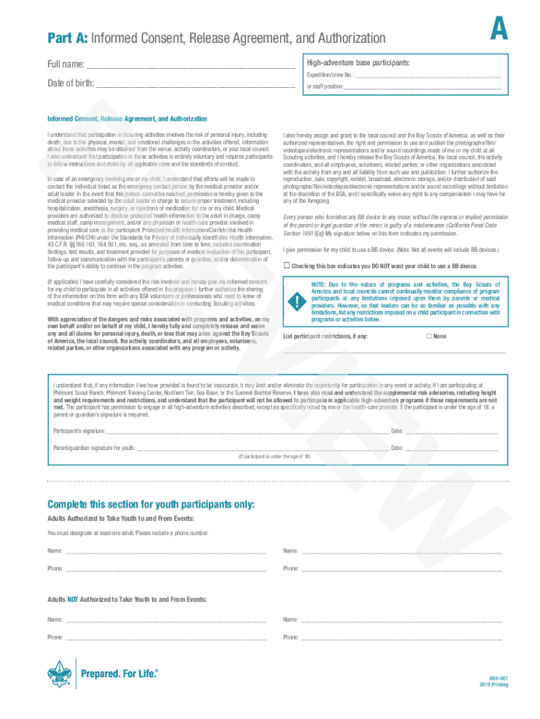 Apart A: Informed Consent, Release Agreement, and Authorization High adventure base participants:Full name: ___ Date of birth:___Expedition/crew No.:___ or staff position:___Informed Consent, Release