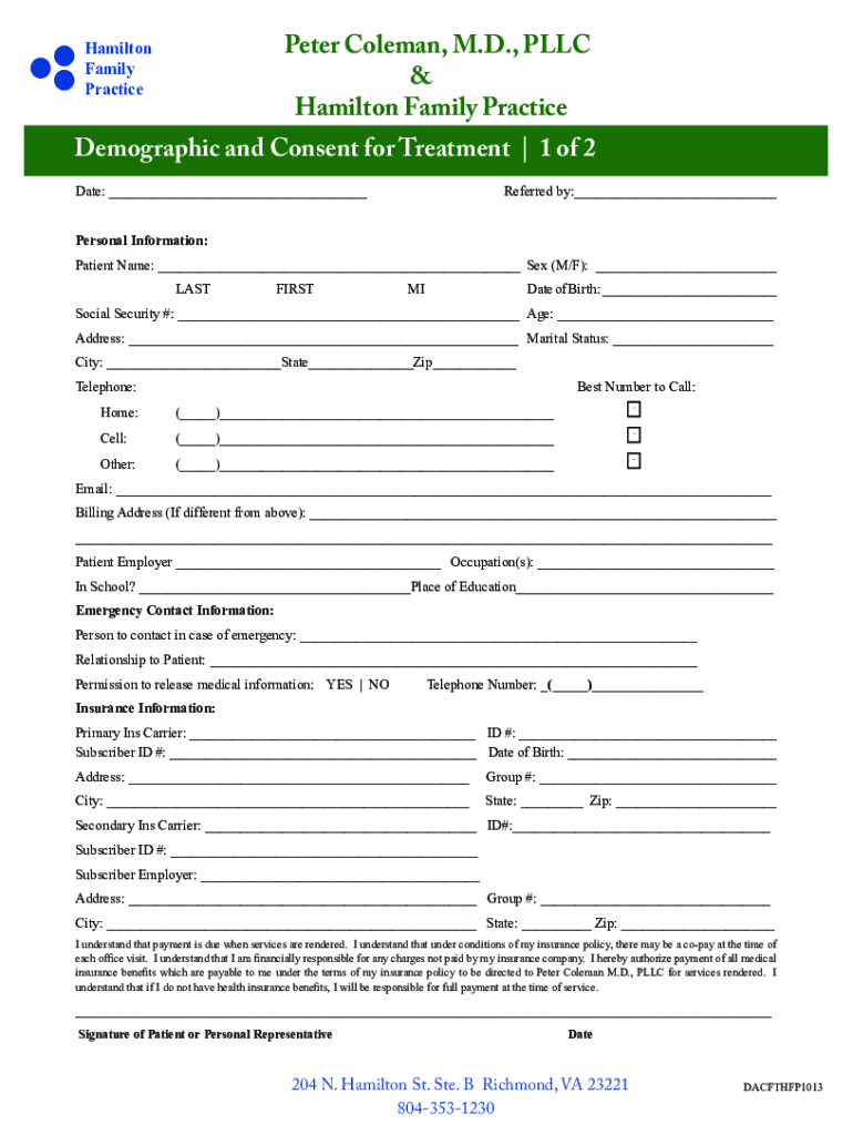 Demeter Coleman, M.D., LLC & Hamilton Family Practice Hamilton Family PracticeDemographic and Consent for Treatment | 1 of 2 Date: ___Referred by:___Personal Information:Patient Name: ___Sex (M/F):