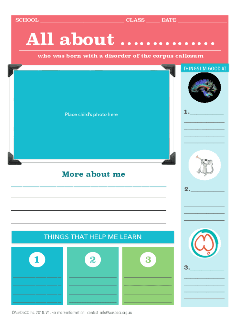 SCHOOL ___ CLASS ___ DATE ___All about who was born with a disorder of the corpus callosumTHINGS I'm GOOD AT1.___Place children photo here___ ___ ___ ___More about me ___ ___ ___ ___2.___ ___ ___