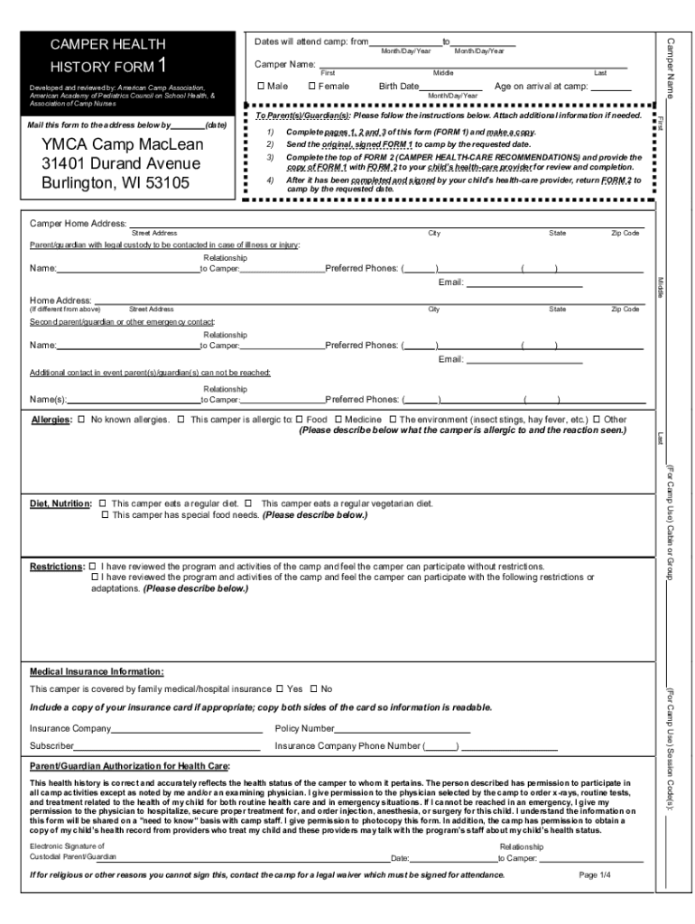 Dates will attend camp: prehistory FORM 1Camper Name:Developed and reviewed by: American Camp Association, American Academy of Pediatrics Council on School Health, & Association of Camp Nurses(date)YMCA