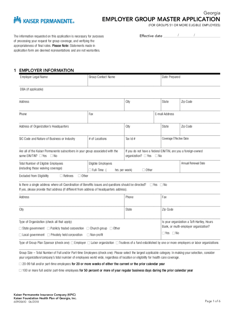 GeorgiaEMPLOYER GROUP MASTER APPLICATION (FOR GROUPS 51 OR MORE ELIGIBLE EMPLOYEES)/Effective battle information requested on this application is necessary for purposes of processing your request