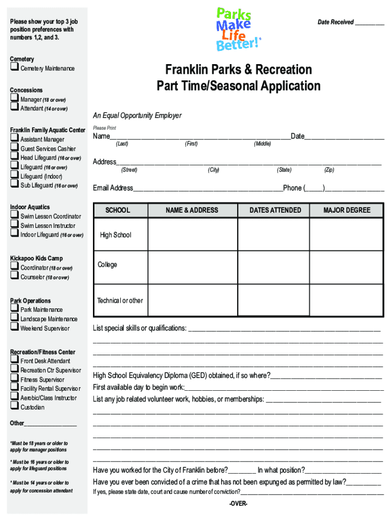 Please show your top 3 job position preferences with numbers 1,2, and 3. Date Received ___Cemetery Maintenance Franklin Parks & Recreation Part Time/Seasonal ApplicationqConcessions Manager (18 or