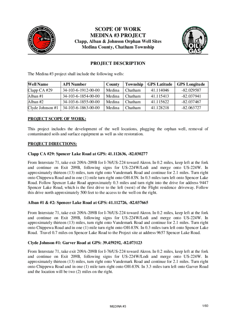 SCOPE OF WORK MEDINA #3 PROJECT Clamp, Alan & Johnson Orphan Well Sites Medina County, Chatham TownshipPROJECT DESCRIPTION The Medina #3 project shall include the following wells: Well Name Clamp