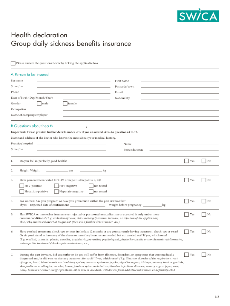 Health declaration Group daily sickness benefits insurance Please answer the questions below by ticking the applicable box. A Person to be insured SurnameStreet/no. Postcode/townPhoneEmailNationalityDate