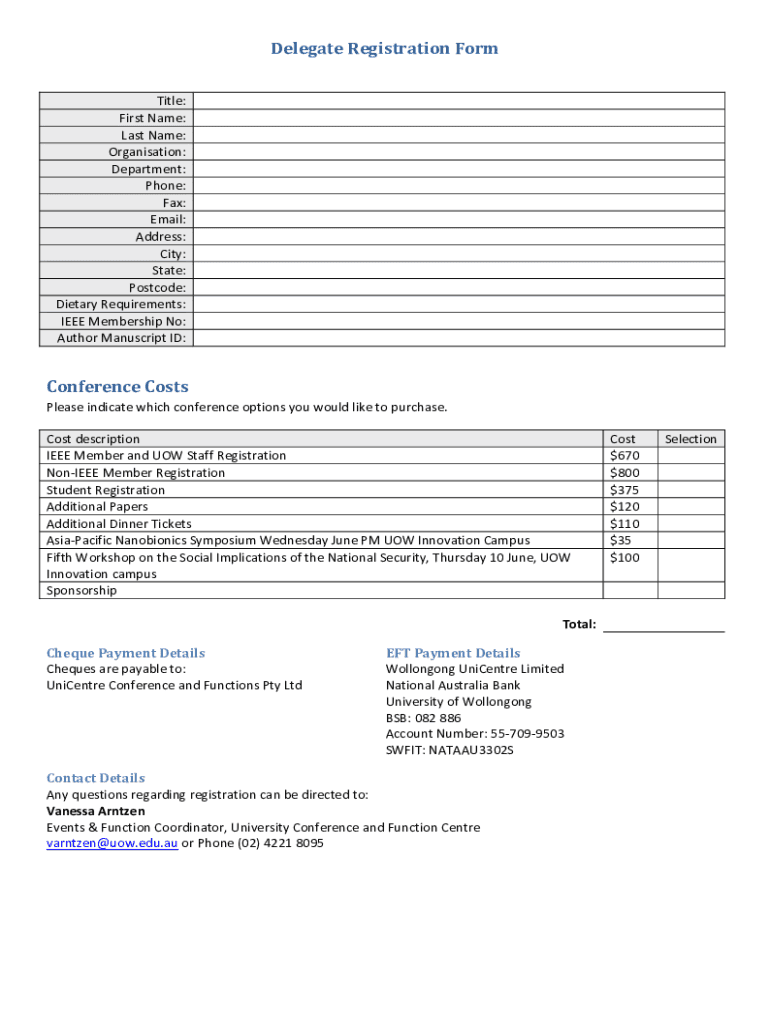 DelegateRegistrationForm Title: Filename: Hostname: Organization: Department: Phone: Fax: Email: Address: City: State: Postcode: DietaryRequirements: IEEEMembershipNo: AuthorManuscriptID: ConferenceCosts