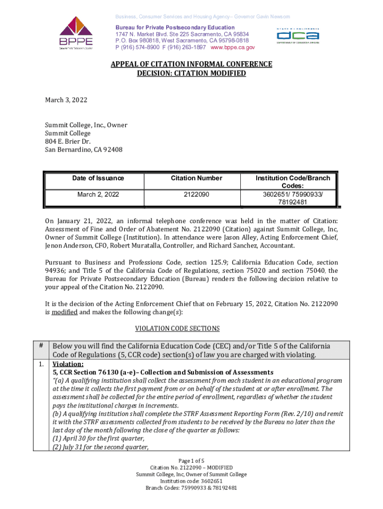 Get the free Bureau for Private Postsecondary Education - Summit College - Appeal of Citation Inf...