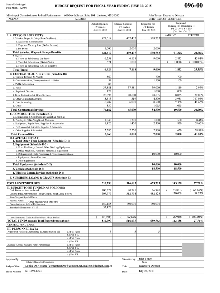 State of Mississippi Form MBR1 (2009)09600BUDGET REQUEST FOR FISCAL YEAR ENDING JUNE 30, 2015Mississippi Commission on Judicial Performance660 North Street, Suite 104 Jackson, MS 39202AGENCYJohn Money,