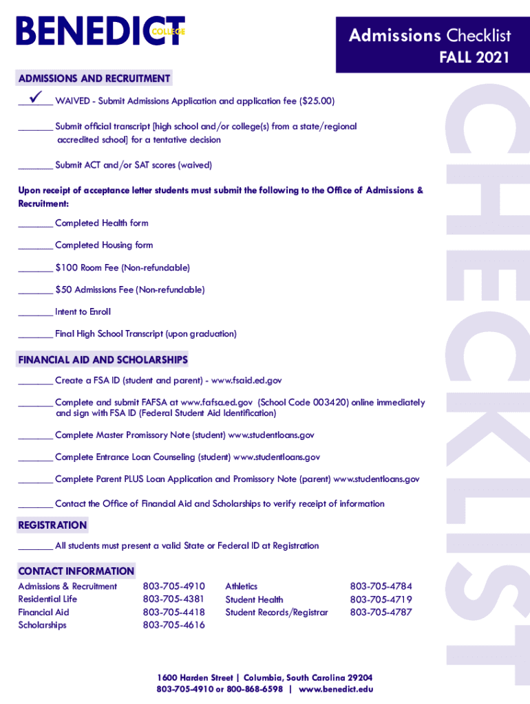 Admissions Checklist FALL 2021 ADMISSIONS AND RECRUITMENT ___ WAIVED Submit Admissions Application and application fee ($25.00) ___ Submit official transcript [high school and/or college(s) from a