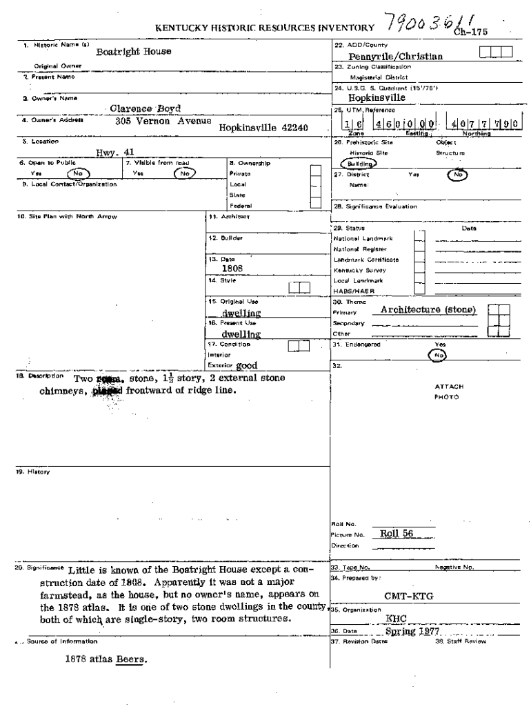 KENTUCKY HISTORIC RESOURCES INVENTORY 1. Historic Name (s)Boat right HousePennvrile /ChristianOriginal Owner\” 23. Zoning Classification?. Present NameMagisterial District)24. U.S.G. S. Quadrant