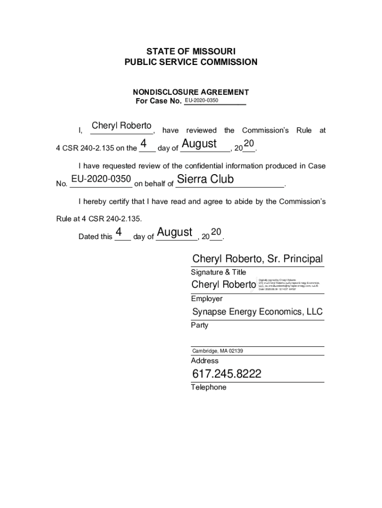 STATE OF MISSOURI PUBLIC SERVICE COMMISSION NONDISCLOSURE AGREEMENT EU20200350 For Case No. ___I, Cheryl Roberto___,havereviewedtheCommissionsRuleat4 day of ___, August 4 CSR 2402.135 on the ___ 20___.