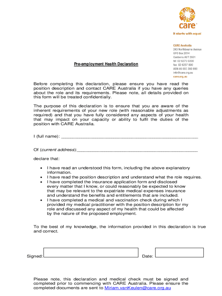 Get the free www.care.org.auwp-contentuploadsPre-employment Health Declaration - CARE Australia