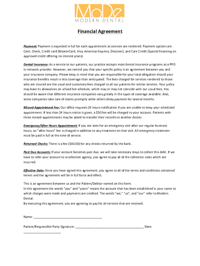 FinancialAgreement Payment:Paymentisexpectedinfullforeachappointmentasservicesarerendered. Paymentoptionsare Cash, Check, Credit card(MasterCard, Visa, American Express, Discover), andCareCredit(Specialfinancingon