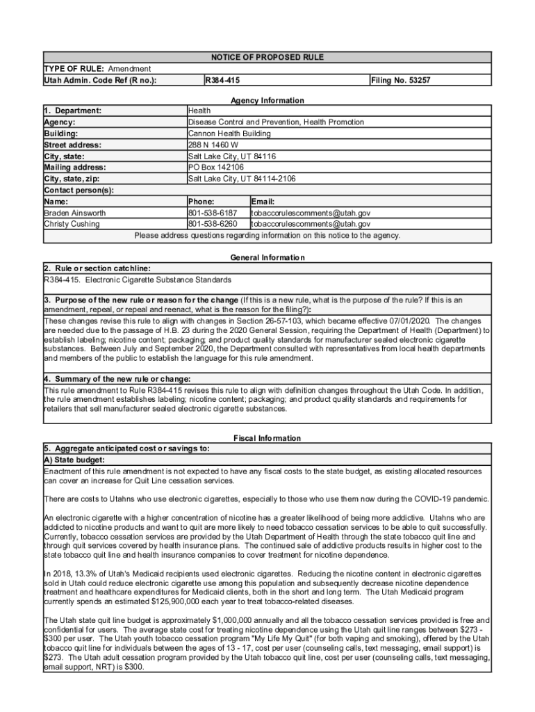 NOTICE OF PROPOSED RULE TYPE OF RULE: Amendment Utah Admin. Code Ref (R no.):1. Department: Agency: Building: Street address: City, state: Mailing address: City, state, zip: Contact person(s): Name: