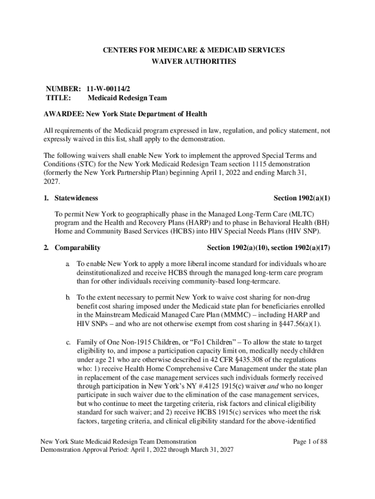 CENTERS FOR MEDICARE & MEDICAID SERVICES WAIVER AUTHORITIESNUMBER: 11W00114/2 TITLE: Medicaid Redesign Team AWARDEE: New York State Department of Health All requirements of the Medicaid program expressed