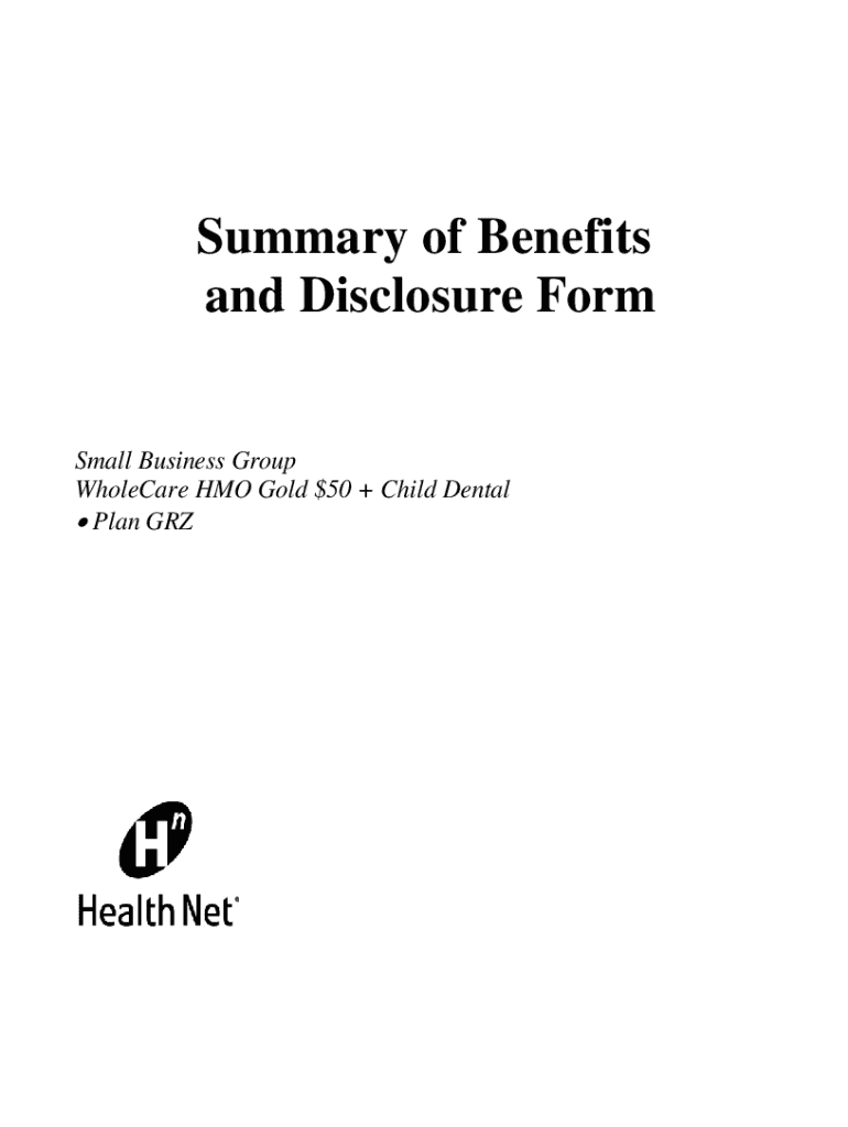 Summary of Benefits and Disclosure Form Small Business Group Wholesale HMO Gold $50 + Child Dental Plan REDELIVERING CHOICES When it comes to your health care, the best decisions are made with the