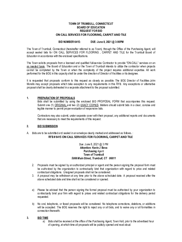 TOWN OF TRUMBULL, CONNECTICUT BOARD OF EDUCATION REQUEST FOR BISON CALL SERVICES FOR FLOORING, CARPET AND TILE BID NUMBER 6415:DUE: June 8, 2021 × 3:00PMThe Town of Trumbull, Connecticut (hereinafter