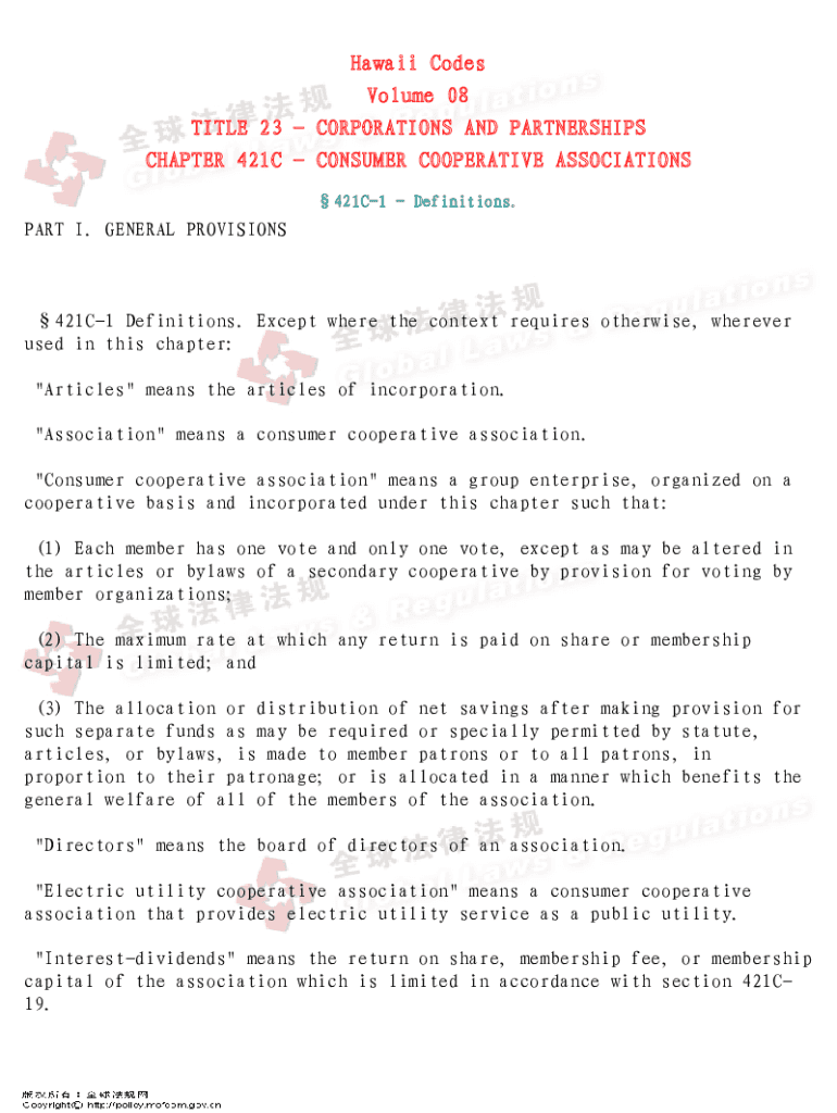 Hawaii Codes Volume 08 TITLE 23 CORPORATIONS AND PARTNERSHIPS CHAPTER 421C CONSUMER COOPERATIVE ASSOCIATIONS 421C1 Definitions.421C1 Definitions. PART I. GENERAL PROVISIONS421C1 Definitions. Except