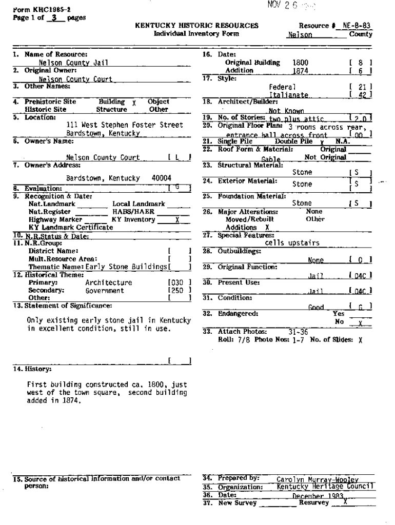NOV 2 6Form KHC19852 Page 1 of 3 pagesResource f NEB83 New son County KENTUCKY HISTORIC RESOURCES Individual Inventory Form 1. Name of Resource:16. Date:Nelson County Aboriginal Building Addition2.