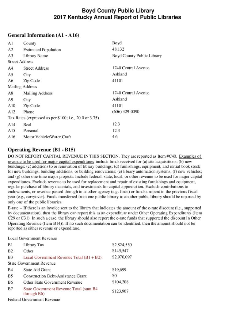 Boyd County Public Library 2017 Kentucky Annual Report of Public Libraries General Information (A1 A16) A1 County A2 Estimated Population A3 Library Name Street Address A4 Street Address A5 City A6