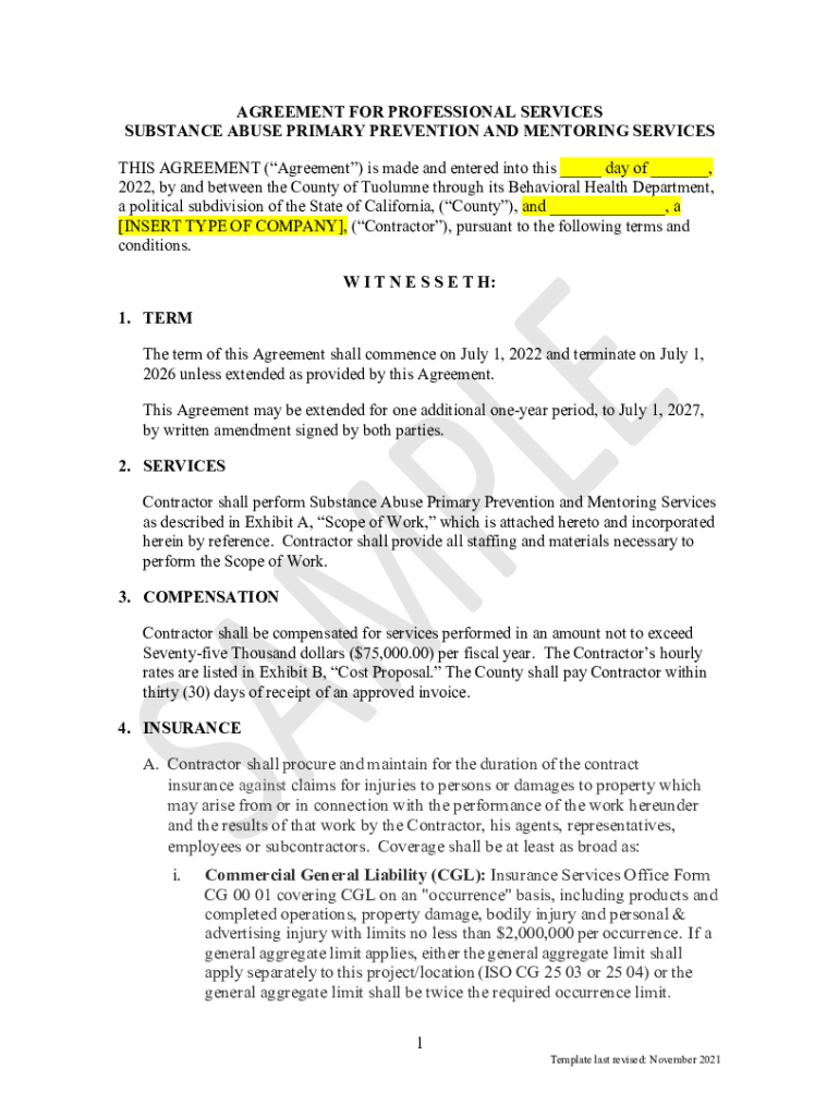 AGREEMENT FOR PROFESSIONAL SERVICES SUBSTANCE ABUSE PRIMARY PREVENTION AND MENTORING SERVICES THIS AGREEMENT (Agreement) is made and entered into this ___ day of ___, 2022, by and between the County