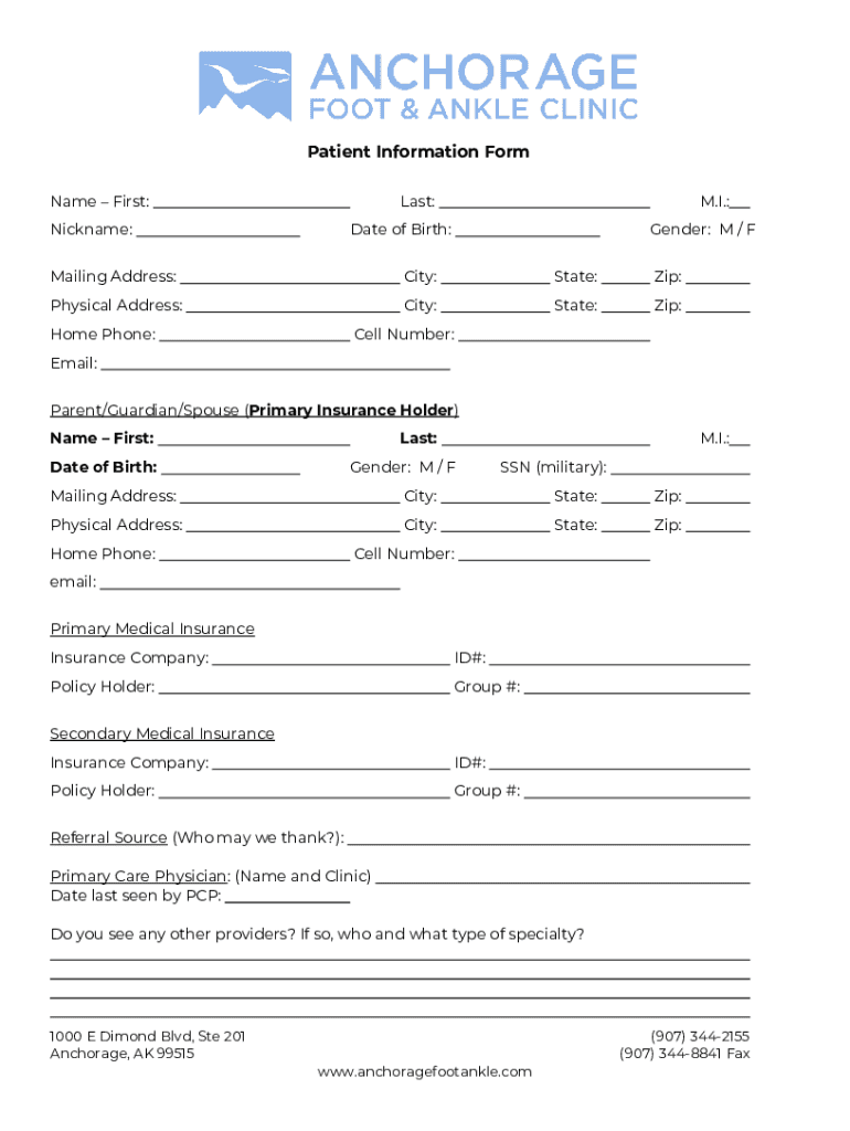 Patient Information Form Name First:Last:Nickname:M.I.:Date of Birth:Gender: M / Failing Address:City:State:Zip:Physical Address:City:State:Zip:Home Phone:Cell Number:Email: Parent/Guardian/Spouse