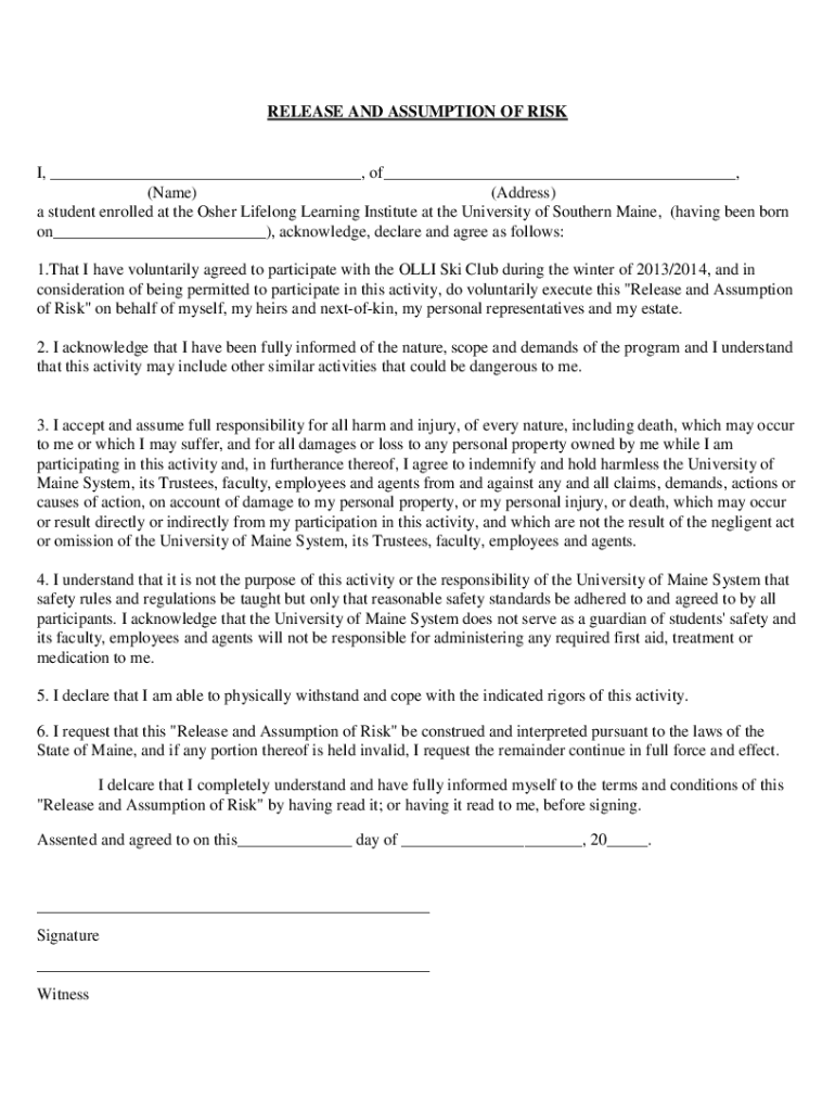 RELEASE AND ASSUMPTION OF RISK, ___, of___, (Name) (Address) a student enrolled at the Other Lifelong Learning Institute at the University of Southern Maine, (having been born on___), acknowledge,