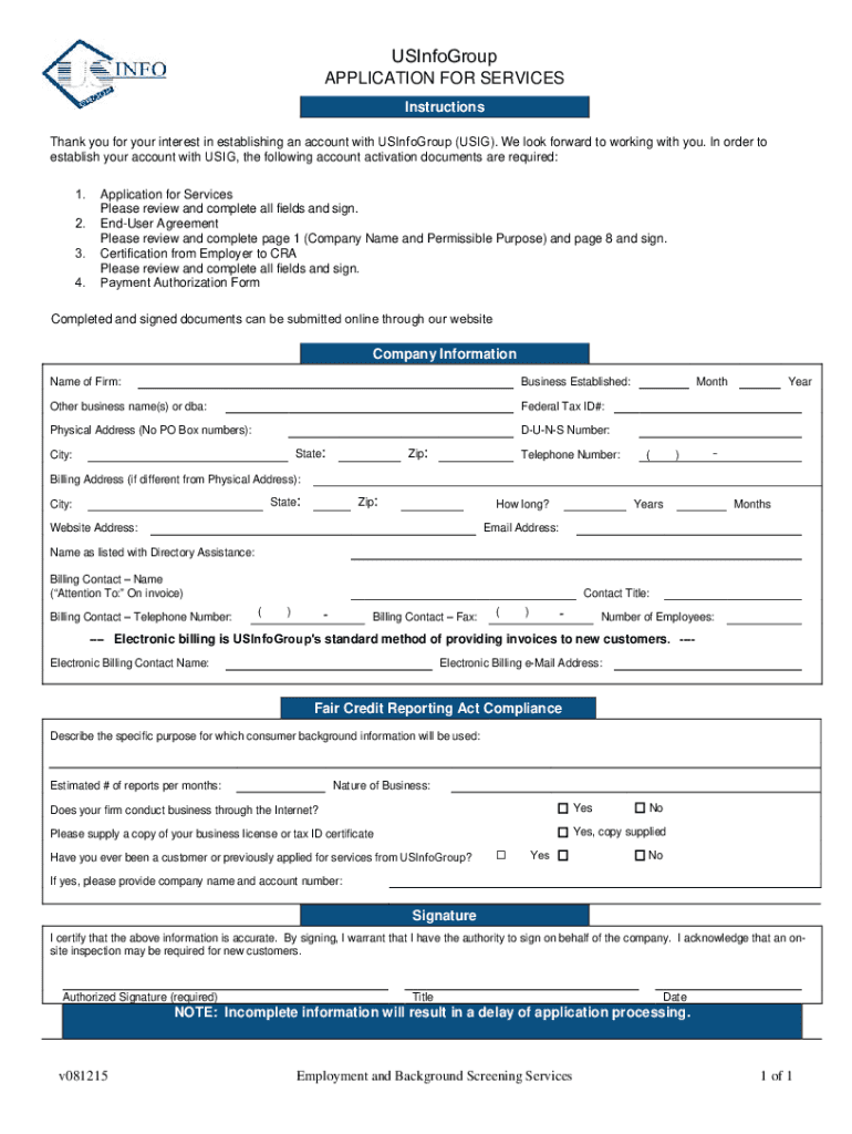 USInfoGroup APPLICATION FOR SERVICES Instructions Thank you for your interest in establishing an account with USInfoGroup (USING). We look forward to working with you. In order to establish your account