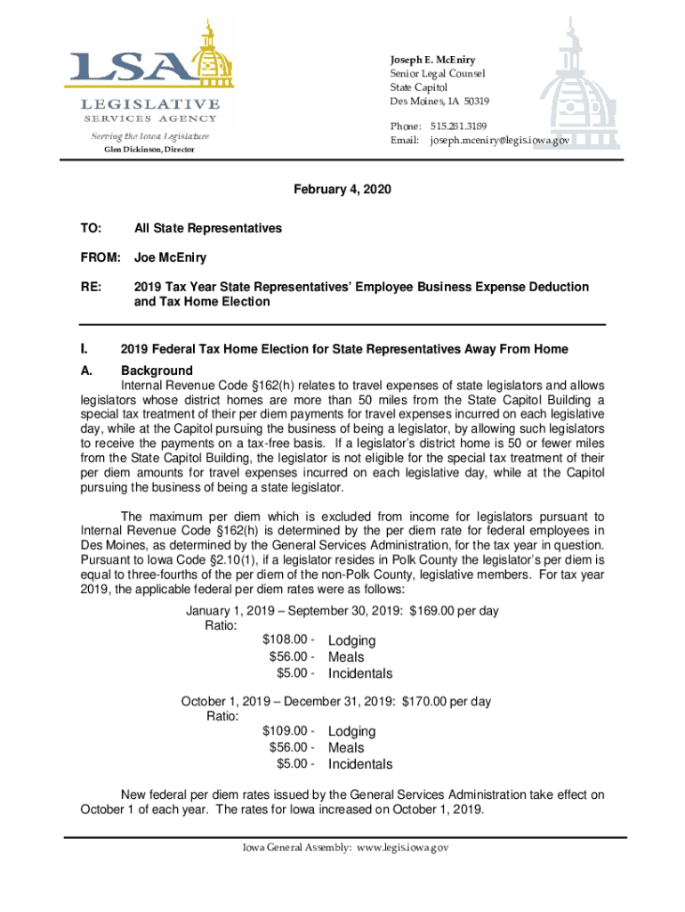 Joseph E. Scenery Senior Legal Counsel State Capitol Des Moines, IA 50319 Phone: 515.281.3189 Email: Joseph. Scenery×Lewis.Iowa.gov Glen Dickinson, Director February 4, 2020, TO:All State RepresentativesFROM:Joe