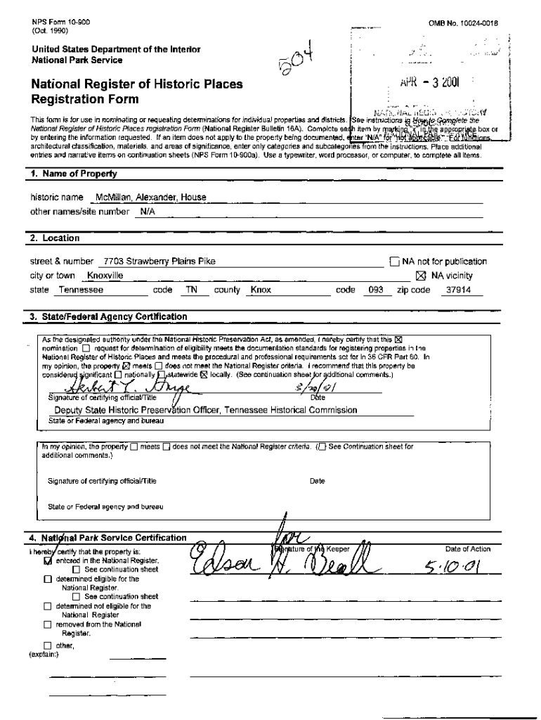 Form 10900 (Oct. 1990)OMB No. 100240018,4United States Department of the Interior National Park Service 3 2001National Register of Historic Places Registration Forms form is for use in nominating