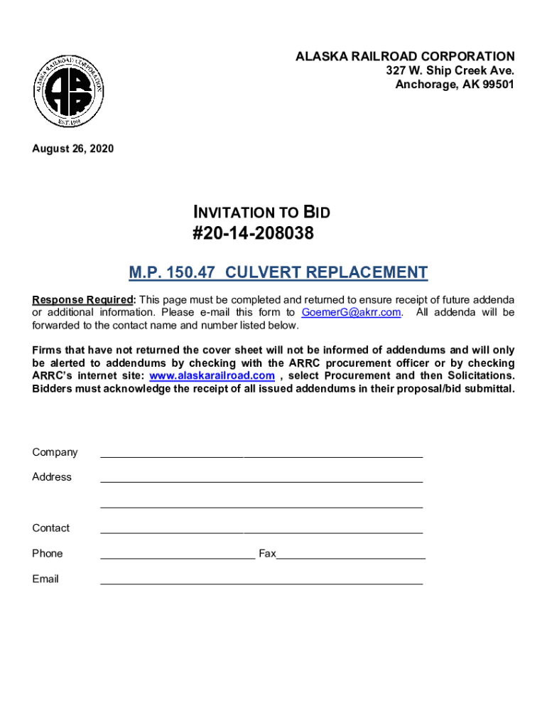 ALASKA RAILROAD CORPORATION 327 W. Ship Creek Ave. Anchorage, AK 99501August 26, 2020INVITATION TO BID #2014208038 M.P. 150.47 CULVERT REPLACEMENT Response Required: This page must be completed and