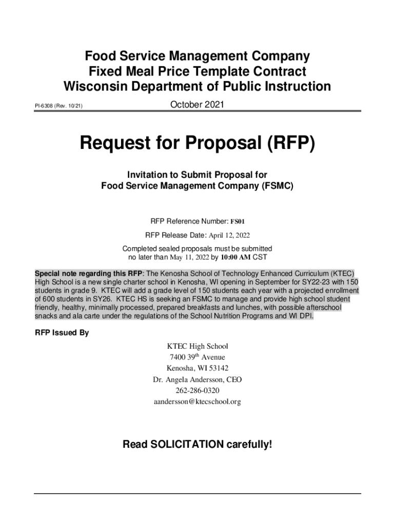 Food Service Management Company Fixed Meal Price Template Contract Wisconsin Department of Public Instruction PI6308 (Rev. 10/21)October 2021Request for Proposal (RFP) Invitation to Submit Proposal