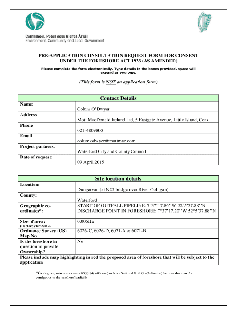REAPPLICATION CONSULTATION REQUEST FORM FOR CONSENT UNDER THE FORESHORE ACT 1933 (AS AMENDED) Please complete the form electronically. Type details in the boxes provided, space will expand as you