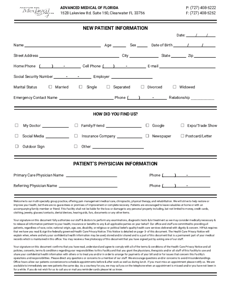 ADVANCED MEDICAL OF FLORIDA 1528 Lake view Rd. Suite 150, Clearwater FL 33756P: (727) 4085222 F: (727) 4085252NEW PATIENT INFORMATION Date: Name. Age. Street Address Home Phone (. City)Social Security