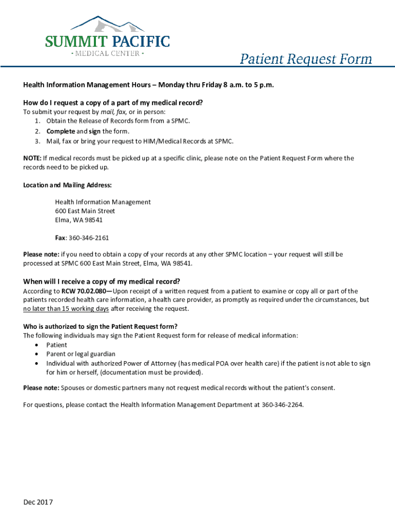 Health Information Management Hours Monday through Friday 8 a.m. to 5 p.m. How do I request a copy of a part of my medical record? To submit your request by mail, fax, or in person: 1. Obtain the