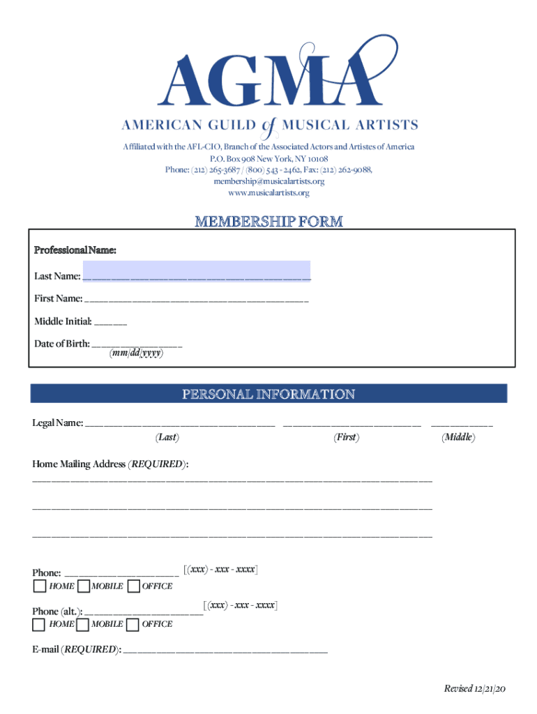 Dear New or Prospective Member: Welcome to the American Guild of Musical Artists, AFL CIO! ALMA is the labor union of professional opera and concert singers, dancers, and production personnel at major