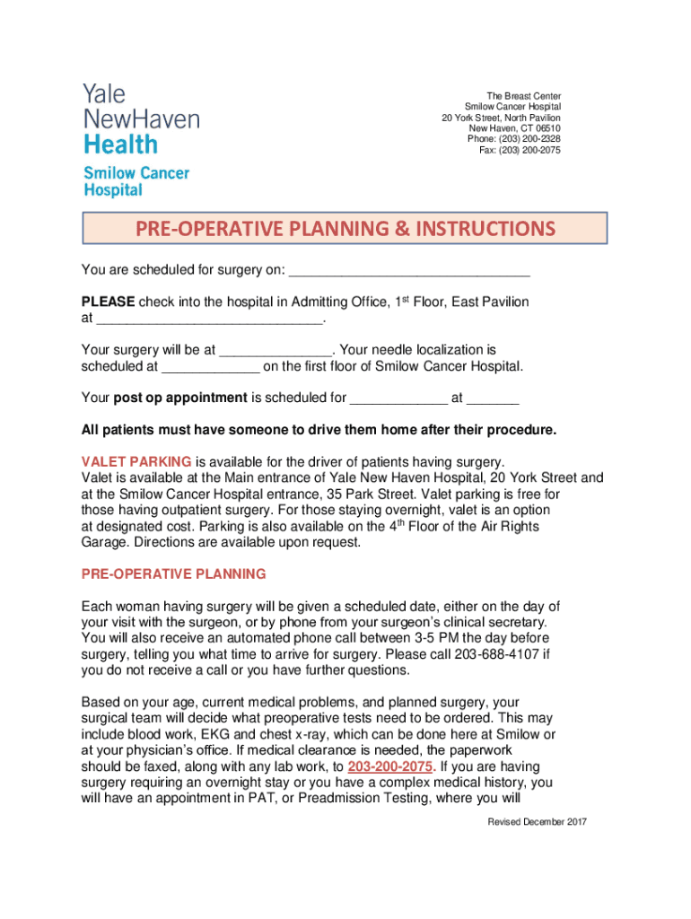 The Breast Center Slow Cancer Hospital 20 York Street, North Pavilion New Haven, CT 06510 Phone: (203) 2002328 Fax: (203) 2002075PREOPERATIVE PLANNING & INSTRUCTIONS You are scheduled for surgery