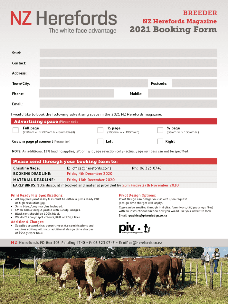 BREEDER NZ Herefords Magazine2021 Booking Form Stud: Contact: Address: Town/City:Postcode:Phone:Mobile:Email: I would like to book the following advertising space in the 2021 NZ Herefords magazine:Advertising